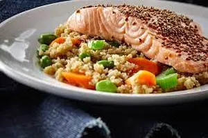 To prepare, preheat oven to 375°F. Season salmon with salt and pepper and bake for 12-15 minutes, until cooked through. Cook quinoa according to package instructions. Toss vegetables with olive oil, salt, and pepper, and roast in the oven for 20-25 minutes, until tender. Drizzle salmon with lemon juice and serve with quinoa and roasted vegetables.